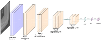 ConvNeXt-Large is a convolutional neural network architecture composed of multiple identical modules, which facilitates model scalability and maintenance [32]. Figure 5 illustrates its 24-layer structure, enabling the extraction of subtle differences and complex details in images, capabilities that are particularly valuable for medical image classification tasks [13]. |