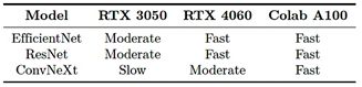 The training process required a high computational load: EfficientNet-B4 exhibited moderate demand, ResNet-50 required less time and memory, and ConvNeXt-Large was the most resource-intensive. Therefore, the PyTorch function torch.cuda.empty_cache() was employed to release GPU memory and reduce the risk of saturation [38]. Table 5 summarizes the observed training performance across the different hardware configurations used. The performance levels are interpreted as follows: |