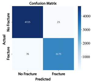 As shown in Table 8, ConvNeXt-Large outperforms EfficientNet-B4 and ResNet-50 across all evaluated metrics, achieving a precision of 99.2%, a sensitivity of 97.7%, and an F1-score of 98.4%, demonstrating its strong ability to classify bone fractures with a low false positive rate. In contrast, EfficientNet-B4 and ResNet-50 performance but lower effectiveness in correctly identifying positive cases. These results indicate that ConvNeXt-Large provides the best balance between precision, sensitivity, and generalization capability.