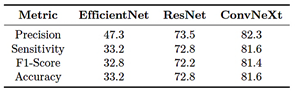 Table 4 summarizes the configurations used for EfficientNet-B4, ResNet-50, and ConvNeXt-Large, including the number of epochs, batch sizes [36], and learning rates, with specific adjustments for multiclass classification.