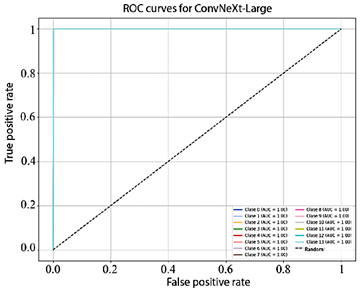 Figure 10 shows that the AUC values obtained by EfficientNet-B4 for each class range between 93.0% and 98.0%. In turn, Figure 11, corresponding to ResNet-50, presents AUC values ranging from 95.0% to 99.0%. Finally, Figure 12 illustrates the AUC curves of ConvNeXt-Large, which range from 98.0% to 100.0%, demonstrating outstanding performance and excellent class discrimination capability.