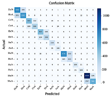 Conversely, Figure 14 shows that ResNet-50 achieves improved classification performance; in this case, most classes are correctly concentrated along the diagonal of the confusion matrix, although misclassifications between Normal Shoulder and Abnormal Wrist remain.