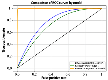 To complement these results, the receiver operating characteristic (ROC) curves and the corresponding area under the curve (AUC) values for each model are presented in Figure 6. EfficientNet-B4 achieved an AUC of 87.1%, ResNet-50 obtained 82.8%, and ConvNeXt-Large reached 99.9%, demonstrating an almost perfect ability to discriminate between classes.