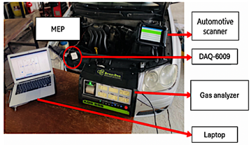 Figure 3 presents the main physical components used to diagnose faults in components and actuators and to predict exhaust gas emissions. These elements include an automotive scanner, the DAQ-6009 data acquisition board, a Brain Bee gas analyzer, and a laptop computer.