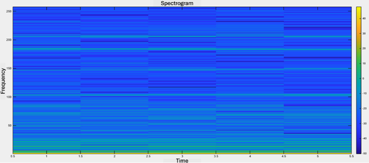 reproduce the characteristic spectro-temporal pattern of the MAP sensor under each operating condition. Figure 7 shows the representative spectrogram corresponding to a sample of the engine under OK operating conditions. The horizontal axis represents time in seconds, while the vertical axis shows the distribution of spectral energy as a function of frequency from 0 to 250 Hz. This range encompasses the dominant variation of the intake-pressure pulse in Otto engines. |