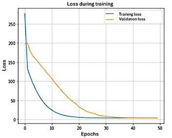 Figure 12 shows the variation of the loss during the convolutional neural network (CNN) training. As expected for this type of network, the loss begins at a relatively high level and decreases rapidly as the model adjusts to the data. This sustained downward trend indicates that the network is learning effectively and progressively optimizing parameters throughout the training process. |