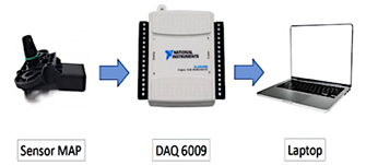 La Figura 1 ilustra los componentes fundamentales empleados en el presente estudio, los cuales incluyen el sensor de presión absoluta del colector (MAP), la tarjeta de adquisición de datos DAQ-6009 y una computadora portátil utilizada como unidad de procesamiento. Por su |
