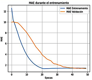 superó el umbral del 5 %, se realizaron ajustes en los parámetros del modelo con el objetivo de mejorar su precisión. La Figura 11 muestra los resultados obtenidos mediante la métrica de error absoluto medio (MAE), utilizada para evaluar el rendimiento del modelo de regresión. Esta métrica permite cuantificar la diferencia entre los valores predichos por la CNN y los valores reales. Como resultado del entrenamiento —desarrollado a lo largo de 50 épocas y un máximo de 900 iteraciones, se obtuvieron valores de MSE de 0.1294 % para CO, 0.0200 % para HC, 0.0320 % para CO2 y 0.0100 % para O2.