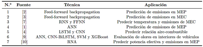 Actualmente, las emisiones generadas por los motores de combustión interna alternativos (MCIA) constituyen una de las fuentes más significativas de contaminación atmosférica en zonas urbanas a escala global, afectando de manera adversa la calidad del aire y representando un desafío ambiental de creciente preocupación. En contraste, la mezcla aire-combustible no siempre se quema de forma completa durante la fase de encendido en los motores de encendido provocado (MEP), debido a ineficiencias asociadas a cambios de temperatura, carga, variaciones en revoluciones por minuto (rpm) e incluso en la presión interna [1]. Por ello, al evaluar la eficiencia de la combustión, se requiere cuantificar los principales contaminantes emitidos: monóxido de carbono (CO), dióxido de carbono (CO2), hidrocarburos sin quemar (HC), óxidos de nitrógeno (NOx) y oxígeno (O2) [2, 3]. A partir de lo expuesto, se vuelve imprescindible adoptar metodologías avanzadas que integren herramientas de matemática computacional e inteligencia artificial [4, 5]. Estas permiten una detección más precisa de fallos en los componentes y actuadores de los motores de combustión interna alternativos (MCIA), así como una caracterización más detallada de las emisiones de gases de escape [6]. Sapio et al. [7] desarrollaron un enfoque híbrido de modelado aplicado a los sistemas de reducción catalítica selectiva (SCR). Específicamente, emplearon redes neuronales recurrentes (RNN) y, a su vez, utilizaron redes neuronales tipo feedforward (FFNN) para predecir tanto la temperatura de salida del sistema catalítico (SC) como las concentraciones de contaminantes, en particular NOx y NH3 [8]. El uso de técnicas avanzadas de aprendizaje supervisado, como las redes neuronales artificiales (ANN), las redes convolucionales bidireccionale (CNNBiLSTM), las máquinas de vectores de soporte (SVM) y el algoritmo de refuerzo de gradiente extremo (XGBoost), ha demostrado ser una alternativa eficaz para mejorar la evaluación de olores en interiores de vehículos [9]. En este sentido, Cesur y Uysal [10] demostraron que el empleo de mezclas de combustibles de metanol y gasolina en motores de encendido provocado (MEP) incrementa en un 3,7 % la potencia efectiva, además de producir una disminución notable en los niveles de NOx y HC. Asimismo, el modelo desarrollado permitió predecir los parámetros de desempeño del motor y sus emisiones con niveles de precisión del 99 % y del 98 %, respectivamente. Por otro lado, para estimar emisiones de CO2 en estudios, emplean distintos algoritmos, entre ellos |