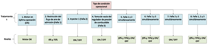 En la Figura 5 se describen las ocho condiciones de operación establecidas para el motor en estudio, cada una acompañada de su correspondiente nivel, incluida la condición de funcionamiento óptimo del motor. |