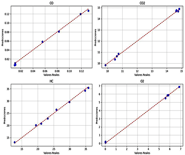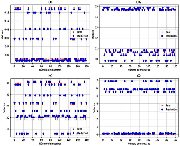 Figura 13. Resultado de la CNN en la estimación de gases de escape: CO, CO2, HC, O2 |