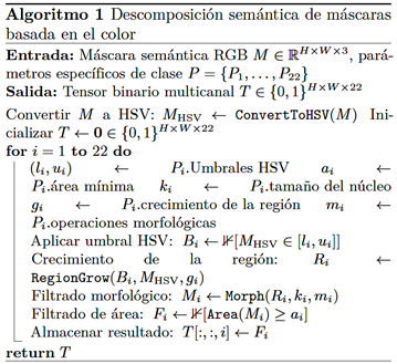 solapamiento de tonos en el límite circular 0°/180°, se empleó un algoritmo de crecimiento de regiones, seguido de operaciones morfológicas de apertura y cierre con tamaños de kernel específicos por clase, orientadas a eliminar artefactos y reforzar la coherencia regional. Asimismo, los componentes conectados con un área inferior a un umbral mínimo predefinido se filtraron, obteniéndose finalmente máscaras one-hot adecuadas para la supervisión durante el entrenamiento [7, 19]. El Algoritmo 1 formaliza este procedimiento. Durante el entrenamiento, el tensor multicanal de 22 clases se colapsa en un único mapa de etiquetas mutuamente excluyentes, el cual es procesado por una cabeza de segmentación con activación softmax. La representación multicanal intermedia se conserva con fines de diagnóstico y para posibles extensiones futuras hacia escenarios de segmentación multietiqueta.
