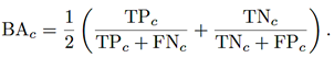 Precisión, recall, F1-score y exactitud balanceada. Para la clase c, ver ecuaciones (3), (4), (5)