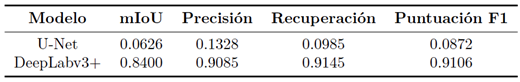 Figura 2. Comparación de salidas de segmentación cualitativas para U-Net y DeepLabv3+. |