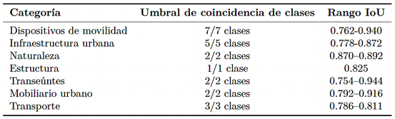 La Tabla 5 reporta la prevalencia a nivel de píxel de cada clase en la partición de prueba, normalizada al 100 %. Las clases dominantes —incluidas edificios, calzadas y vegetación adyacente a la vía— concentran la mayor proporción de píxeles, mientras que los dispositivos de movilidad y los elementos de infraestructura de pequeña escala representan una fracción marginal del conjunto de datos. |