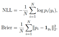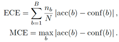 Calibración y métricas probabilísticas. Para evaluar la calibración probabilística de las predicciones, se calcularon el error de calibración esperado (ECE), el error máximo de calibración (MCE), la logverosimilitud negativa (NLL) y la puntuación de Brier. En particular, el ECE y el MCE se estiman dividiendo el rango de confianza [0, 1] en B intervalos (bins), donde nb denota el número de predicciones cuya confianza cae dentro del intervalo b, ver ecuación (6):