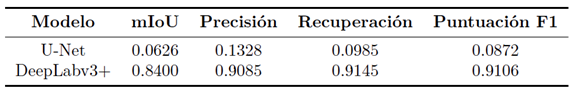 Tabla 3. Comparación del rendimiento global de U-Net y DeepLabv3+ en SYNTHUA-DT (conjunto de prueba)