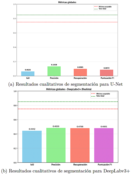 Figura 2. Comparación de salidas de segmentación cualitativas para U-Net y DeepLabv3+. |