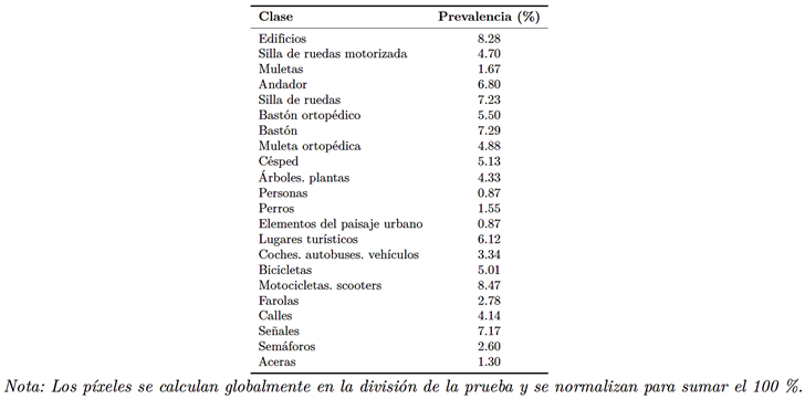 La Tabla 5 reporta la prevalencia a nivel de píxel de cada clase en la partición de prueba, normalizada al 100 %. Las clases dominantes —incluidas edificios, calzadas y vegetación adyacente a la vía— concentran la mayor proporción de píxeles, mientras que los dispositivos de movilidad y los elementos de infraestructura de pequeña escala representan una fracción marginal del conjunto de datos. |