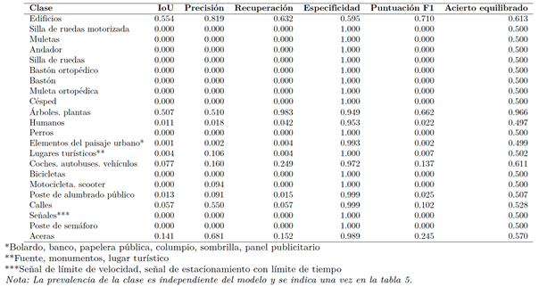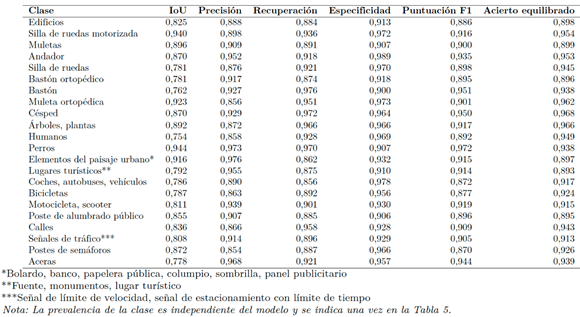 Todas las clases de dispositivos de movilidad incluidas sillas de ruedas, andadores, bastones, muletas y variantes ortopédicas— alcanzan valores de IoU entre 0.762 y 0.940, lo que indica una detección fiable a través de distintos puntos de vista y condiciones de iluminación. La clase aceras alcanza un IoU de 0.778 con un recall de 0.921, en comparación con un recall de 0.153 obtenido por U-Net, lo que supone una reducción de los falsos negativos de aceras superior al 80 %. Desde una perspectiva aplicada, este resultado disminuye de forma significativa la probabilidad de sugerir terreno no transitable como aceras a usuarios de sillas de ruedas.