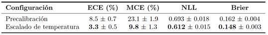 El escalado de temperatura reduce el ECE en aproximadamente un 61 % y el MCE en un 58 %, y mejora asimismo la NLL y la puntuación de Brier. La sobreconfianza queda en gran medida confinada al intervalo de mayor confianza (> 0.8), y la incidencia de clasificaciones erróneas con alta confianza es sustancialmente menor que en U-Net. Esta mejora resulta especialmente relevante para los módulos posteriores que deben tomar decisiones conscientes del riesgo. |