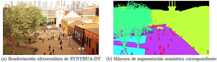 Figura 1. Ejemplo de un par SYNTHUA-DT: (a) imagen RGB de alta fidelidad; (b) máscara semántica perfecta a nivel de píxel.