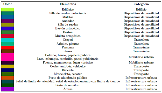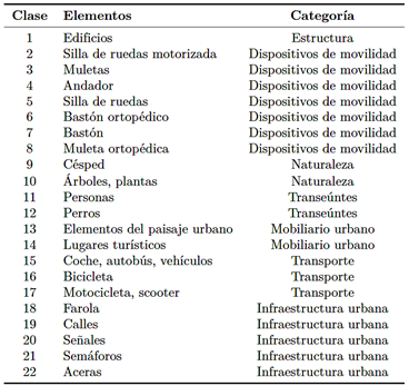 Las 22 clases semánticas se agrupan en siete categorías funcionales, como se presenta en la Tabla 2, reflejando los requisitos de accesibilidad urbana al diferenciar explícitamente dispositivos de movilidad, infraestructura, elementos naturales y clases relacionadas con peatones.