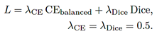 Las clases semánticas se consideran mutuamente excluyentes y la cabeza final de predicción emplea una activación softmax de 22 vías. En consecuencia, el objetivo de entrenamiento se define mediante una función de pérdida compuesta que combina una pérdida de Entropía Cruzada balanceada por clase con una pérdida Dice suavizada, con el fin de mitigar el desbalance de clases y mejorar la superposición espacial de las regiones segmentadas, ver ecuación (1):