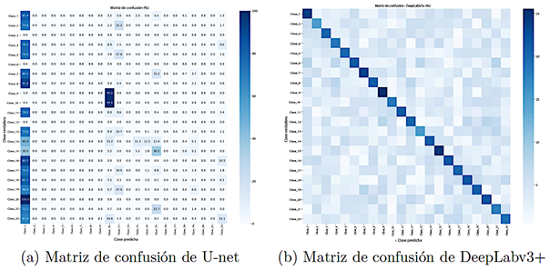 Figura 3. Comparación de matrices de confusión entre U-Net y DeepLabv3+. U-Net muestra un fuerte sesgo hacia las clases dominantes, mientras que DeepLabv3+ produce predicciones más precisas y diferenciadas.