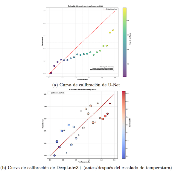 Figura 7. Comparación de la calibración del modelo para U-Net y DeepLabv3+. Las curvas relacionan la confianza predicha con la precisión empírica (véanse las definiciones de ECE/MCE en la Sección 2.6).