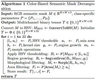 Color-coded masks were converted into a multichannel binary tensor of shape (512 × 512 × 22) using HSVbased thresholding to isolate each class’s hue range. A region-growing algorithm handled hue wraparound at the 0°/180° boundary, followed by morphological opening and closing with class-specific kernel sizes to remove artifacts and enforce region coherence. Small connected components below a minimum area threshold were filtered out, yielding one-hot masks for supervision [7, 19]. Algorithm 1 formalizes this procedure. For training, the 22-channel tensor is collapsed into a single, mutually exclusive 22-class label map used by a softmax segmentation head. The intermediate representation is retained for diagnostics and potential multi-label extensions.