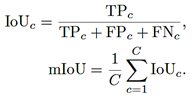 Segmentation performance and calibration are evaluated using standard metrics at both the class and dataset level. Intersection over Union (IoU) and mIoU. For class c, see equation (2)