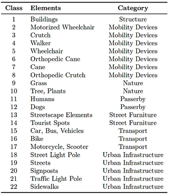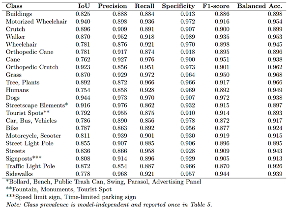 Table 5 reports pixel-level prevalence for each class on the test split, normalized to 100%. Dominant classes, including Buildings, Streets, and street-adjacent vegetation, account for most pixels, whereas mobility devices and small infrastructure elements constitute ultraminority. |