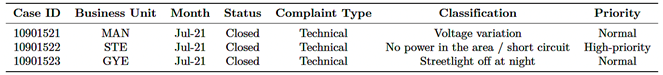 An institutional database from CNEL EP was compiled, comprising 143,113 historical records of technical complaints. Each record contains variables such as |