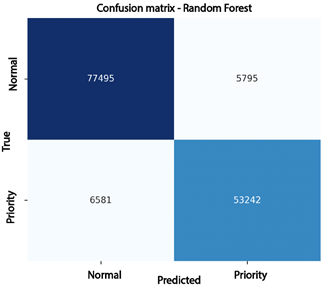 These results show that the model achieves a better balance between sensitivity and precision, reducing the classification errors observed in the Decision Tree. In practical terms, the Random Forest improves the identification of high-priority complaints while maintaining a low false-positive rate, making it a more reliable tool for supportingoperational prioritization. Figure 3 shows the confusion matrix for the Random Forest model. This model exhibits more balanced and accurate performance, correctly classifyin g77,495 normal complaints and 53,242 high-priority complaints. Classification errors were relatively small: 5,795 normal complaints were incorrectly identified as highpriority, while 6,581 high-priority complaints were classified as normal. This behavior confirms the model’s