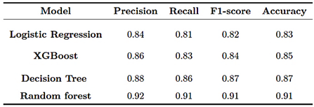 The Random Forest model achieved 91% accuracy and an average F1-score of 0.91, making it the most robust and stable alternative. The Decision Tree showed slightly lower performance, with 87% accuracy and an F1-score of 0.87, while still providing solid classification capability but with greater variability between classes. XGBoost achieved 85% accuracy and an F1- score of 0.84, exhibiting a mild tendency toward overfitting in the minority class. Finally, Logistic Regression, although |
