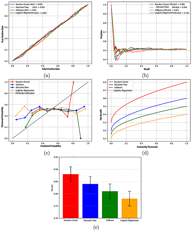 Figure 4. a) ROC curves of the classification models. b) Precision–recall curves for the models. c) Calibration curves for the models. d) Decision-curve analysis. e) 95% confidence intervals for PR-AUC |