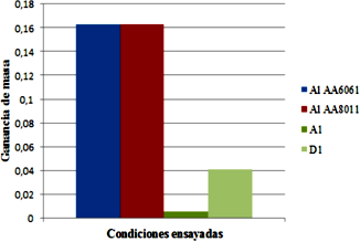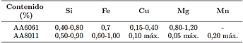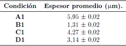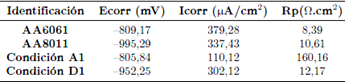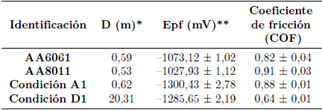 El presente trabajo muestra la evaluación del desempeño de dos aleaciones comerciales de aluminio anodizadas ante la corrosión y tribocorrosión. Para el anodizado se emplearon dos tipos de electrolitos distintos (H2SO4 y H2C2O4), un valor constante de densidad de corriente y dos tiempos de anodizado (30 y 45 minutos). Usando una de las técnicas de microscopía electrónica de barrido (MEB) y espectroscopía por dispersión de la energía de rayos X (EDX) se caracterizaron las aleaciones y la morfología de las superficies formadas en las capas de óxido para las condiciones establecidas. Se encontraron diferencias notables entre la condición de anodizado (A1) a 45 minutos en H2SO4 para la aleación AA6061, y la condición de anodizado (D1) para el mismo tiempo en H2C2O4 para la aleación AA8011. En la condición de anodizado (A1) se encontró la formación de la morfología tipo smudge distintiva de la solución electrolítica utilizada, con un espesor promedio de capa anódica de 5,95 ± 0,02 μm, mientras que, para la condición de anodizado (D1) se obtuvo un espesor de 3,14 ± 0,02 μm, con la aparición de cavidades en toda la extensión de su superficie. |