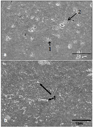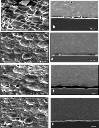 In this work were studied two commercial anodized aluminum alloys under conditions of corrosion and tribocorrosion. For two different types of anodizing electrolyte (H2SO4 and H2C2O4), a constant value of current density and two anodizing time (30 and 45 minutes) were used. Using techniques of Scanning Electron Microscopy (SEM) with Spectroscopy Energy Dispersive X-Ray (EDS) coupled, were characterized the alloys and morphologies of the surfaces formed in the oxide layers. Results obtained show large differences between the condition of anodized (A1) in sulfuric acid for 45 minutes in AA6061 alloy and anodized condition (D1) for the same time in oxalic acid for alloy AA8011. For sample (A1), the results reveals the formation of a morphology named "smudge" which is characteristic of the electrolytic solution used and for this case the average thickness was 5,95 ± 0,02 μm. For sample (D1), the average thickness was 3,14 ± 0,02 μm and revealing the generation of cavities along all surface area. |