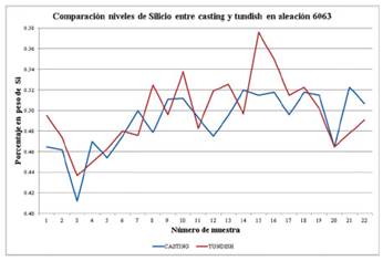 Figura 2. Comparación niveles de Si entre casting y tundish. Al realizar los ensayos espectrométricos para conocer los porcentajes en peso de silicio (Figura 2), en ambos casos se obtuvo que un cincuenta por ciento de las muestras están |