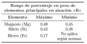 En cambio, de aquí en adelante se va a denominar la aleación con niveles experimentales como aleación «B», cuyos rangos de porcentaje en peso de los elementos principales a controlar se indican en la Tabla 2.