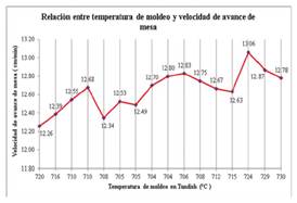 Figura 4. Velocidad avance de mesa vs. temperatura de moldeo. |