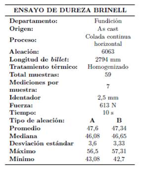 decidió tomar 22 muestras respectivamente porque control de calidad ase dos muestras de tundish en cada hora por turno de ocho horas de producción y someter las muestras a ensayo de espectrometría para controlar los niveles de aleación basados en norma ASTM E716 y E1251 con discos tipo B. La recolección de datos estadísticos descriptivos sobre la relación entre temperatura de moldeo y el avance de mesa, fue realizada en los turnos de trabajo durante la producción de la aleación A y B, mismas que serán descritas en el literal 2.2 y se los obtuvieron por medio de tableros de control y medición de avance de mesa con cronómetro en intervalos de tiempo cada 10 minutos. Para ensayos de dureza Brinell y espectrometría de los billets, fueron necesarios un total de ocho billets (cuatro de aleación A y cuatro de aleación B) con un costo de producción de $700 USD cada uno, luego se compararon rangos de aleación con el objetivo de discriminar información y quedarse con un billet por cada aleación con la intención de realizar cortes consecutivos con espesor promedio de 35 mm y reservándose un corte mayor de la sección media a fin de obtener las probetas para ensayo de tracción, medición de dureza y espectrometría completando así un total de 59 muestras por billet.