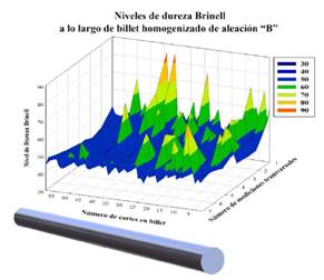 Figura 6. Dureza Brinell a lo largo del billet homogenizado de aleación «B».