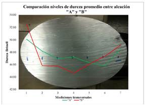 Gráficamente advierte en la Figura 7 la comparación entre ambas aleaciones. Al contrario de lo que se podría esperar por los niveles en aleantes principales que posee la aleación «B», esta posee apenas en promedio un 0,55 % menor dureza que la aleación «A».