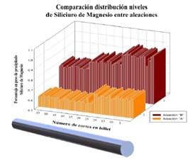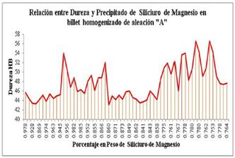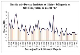 La escasez de estudios in situ sobre procesos de colada continua horizontal en aleaciones de aluminio, impulsa la necesidad de investigar la influencia de temperatura, velocidad y materia prima en billets de aluminio homogenizados AA6063. Aplicando ensayos de espectrometría, permiten cuantificar el porcentaje en peso de aleantes principales magnesio y silicio. Estos elementos al precipitar forman siliciuro de magnesio (Mg2Si) durante el proceso de homogenizado. Para este estudio se produjo billets de aleación normal y experimental, demostrando una relación inversa entre los niveles de siliciuro de magnesio y dureza Brinell; así también la influencia de bajos niveles de porcentaje en peso de Mg2Si en la reducción de la resistencia a la tracción en el material.