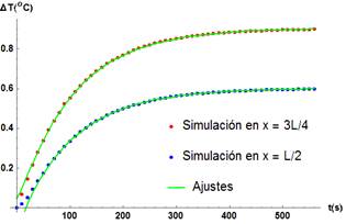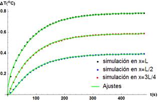 Figura 3. Gráfico del ajuste de la distribución de temperatura vs. tiempo cuando se calienta la barra de cobre en la posición (x = L). Se tiene una convergencia absoluta entre simulación y modelo en los tres puntos de monitoreo.