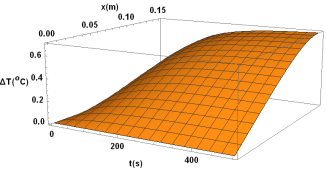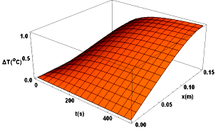 En la Figura 4 se aprecia el gráfico de la distribución de temperatura en función de la coordenada x y el tiempo t, según la ecuación (2), con los valores de y obtenidos en la Tabla 1, q = 0, 1W, A = 4, 9.10-5 m2, L = 0, 15 m. Nótese que, el aumento de temperatura es pequeño (menor a un grado) lo que resulta conveniente a la hora de poner en marcha esta medición en el laboratorio.