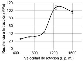 Para velocidades de la herramienta comprendidas entre 400 hasta 1000 rpm no existe una variación considerable de la resistencia a la tracción; sin embargo, para velocidades mayores a 1000 rpm la resistencia a la tracción aumenta según se muestra en la Figura 6 coincidiendo con las probetas que presentan mejor soldadura.