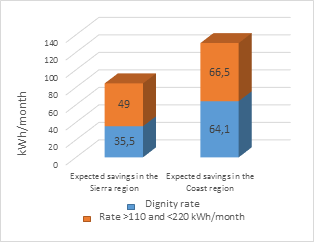 Table 6 details the savings behavior by energy rate. The average savings is 12.17 kWh/month for a subscriber of the dignity fare (subscribers who consume up to 110 kWh/month in the Sierra and 130 kWh/-month in the Coast, for which the power distributors charge $0.04 per kWh) compared to 28 kWh/month for a subscriber with consumption between 110 and 220 kWh per month. This result clearly shows that the higher the consumption is, the greater the savings are. Figure 2 shows the expected savings per base month for the Renova Refrigerator program according to the type of consumer and the region.